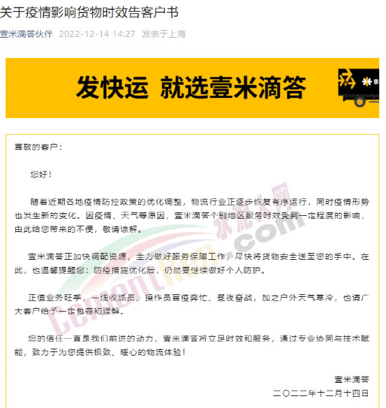 壹米滴答通知,隨著近期各地疫情防控政策的優化調整,物流行業正逐步恢復有序運行,同時疫情形勢也發生新的變化。因疫情、天氣等原因,壹米滴答個別地區服務時效受到一定程度的影響。
