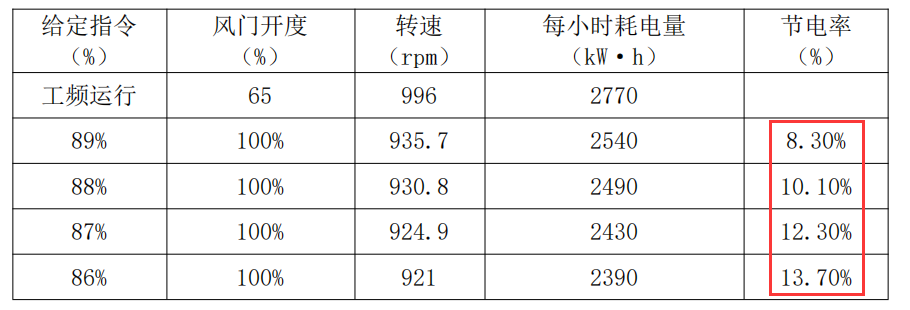 相較于工頻轉速,65%風門開度節電率約為13.7%。