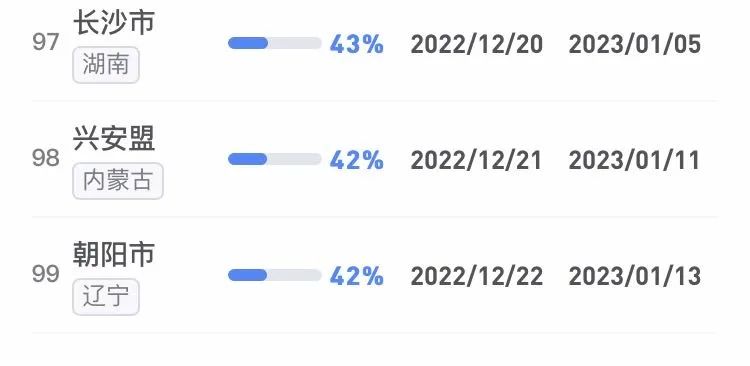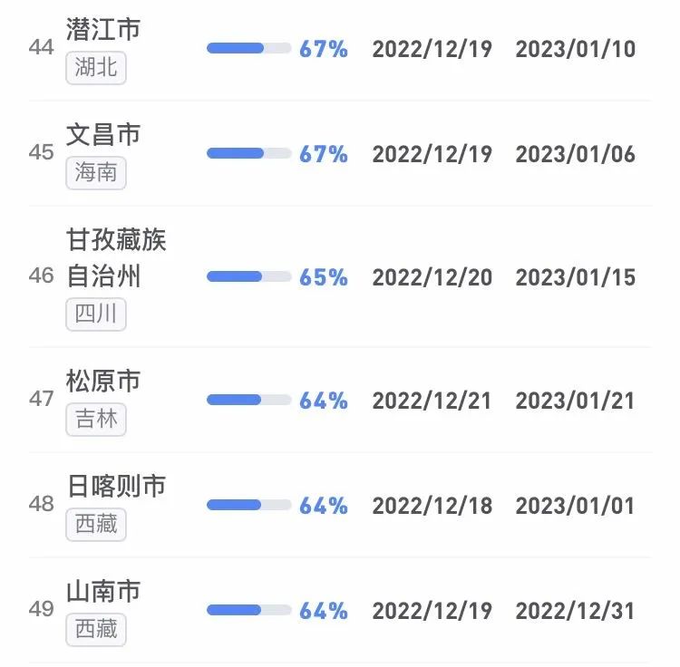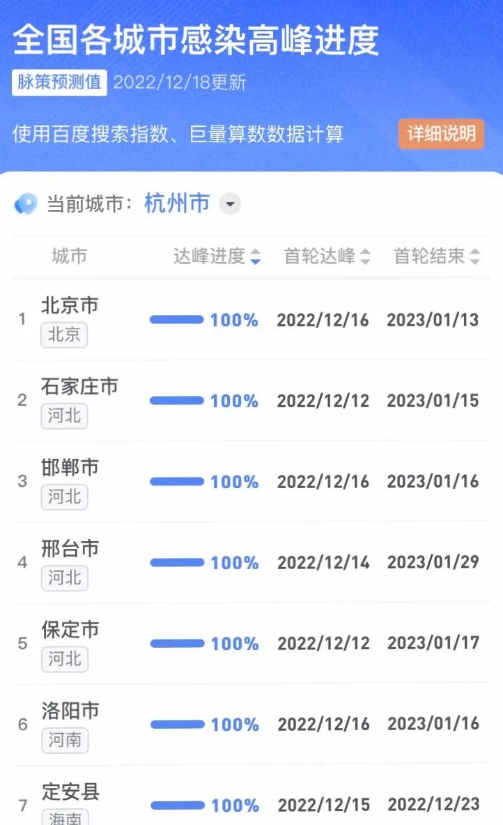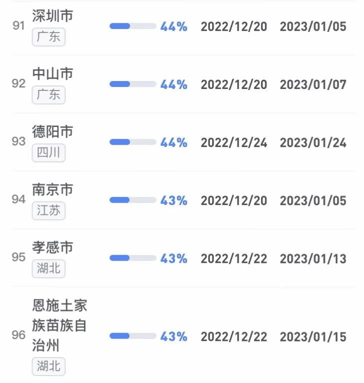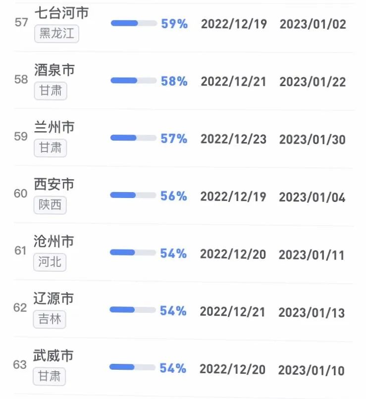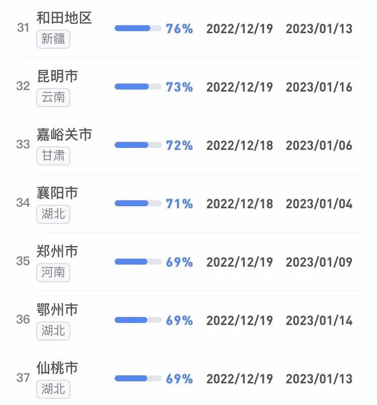 據不完全統計,全國感染進度100%的城市已累計達17個,其中石家莊市、保定市、甘南藏族自治州、克孜勒蘇柯爾克孜自治州均在12日就達到首輪感染峰值。成都市、武漢市等76個市達峰進度已超過50%。