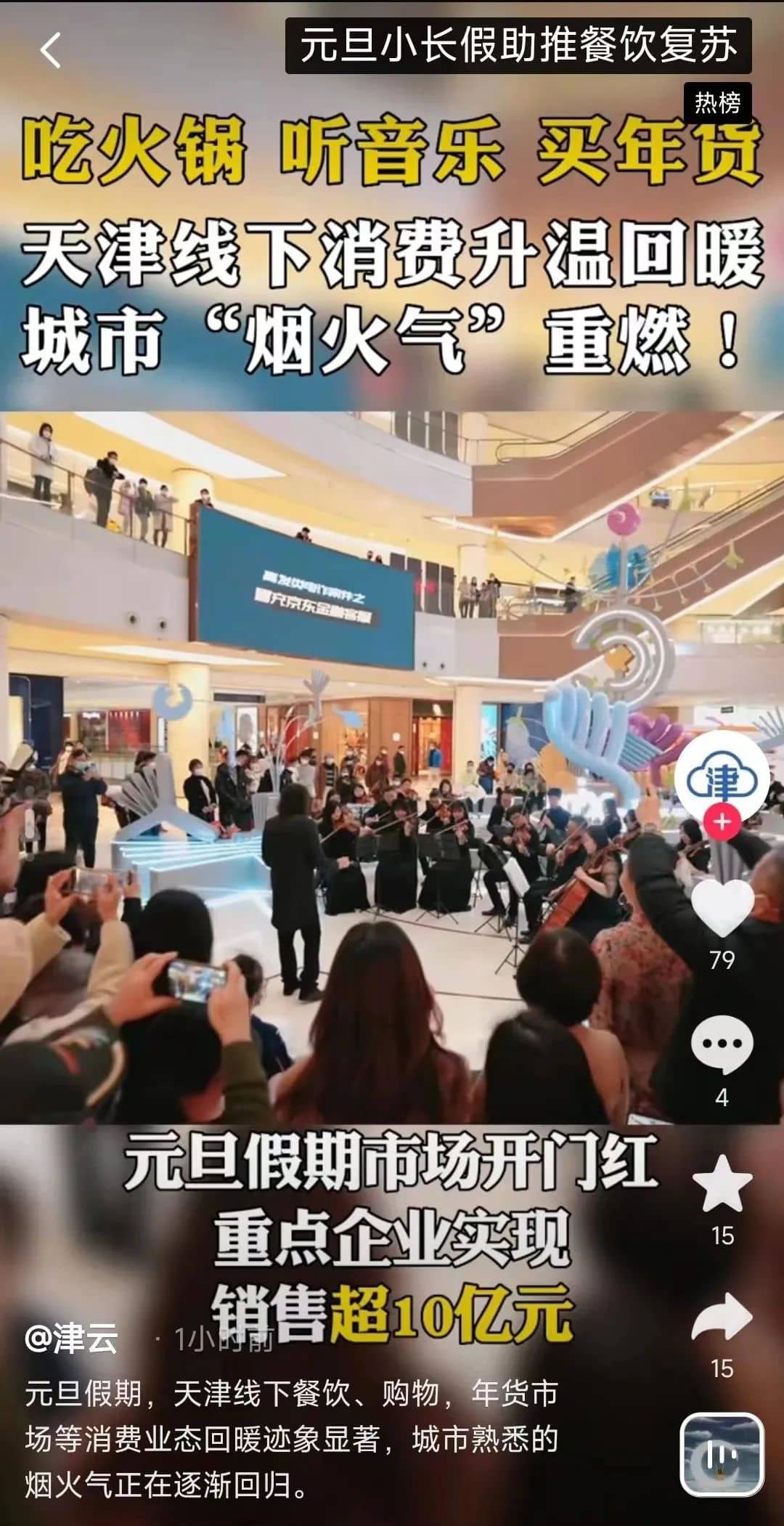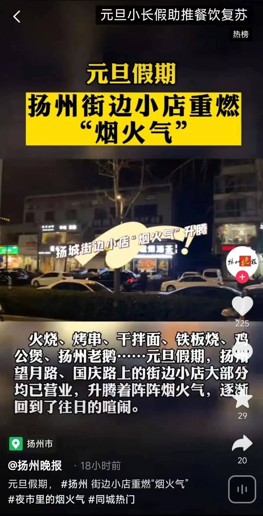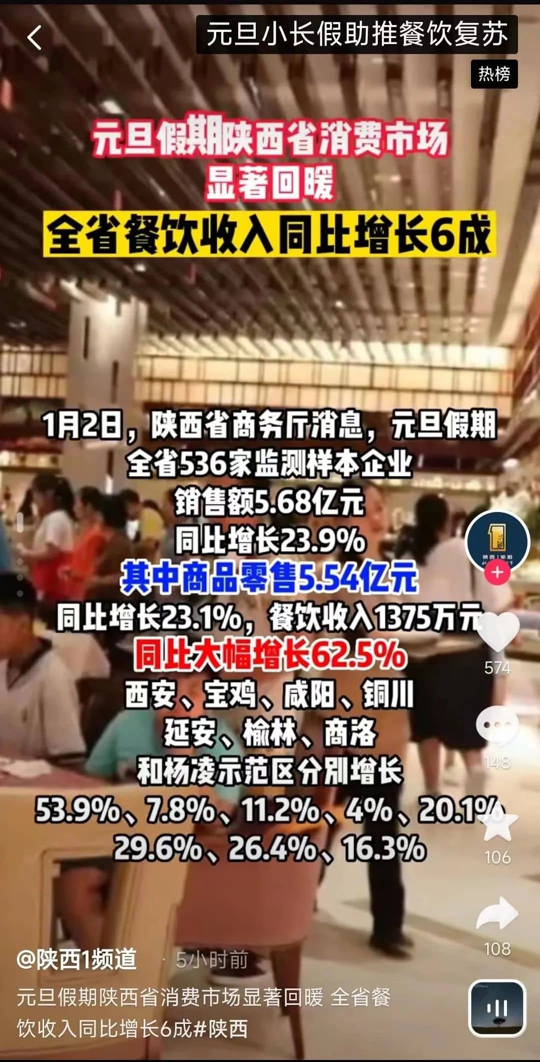 近日,“元旦小長假助推餐飲復蘇”登上了熱榜。陜西全省餐飲收入同比增長6成,天津元旦假期重點企業實現銷售超10億元,楊州望月路、國慶路上的店鋪回到了往日的喧鬧……