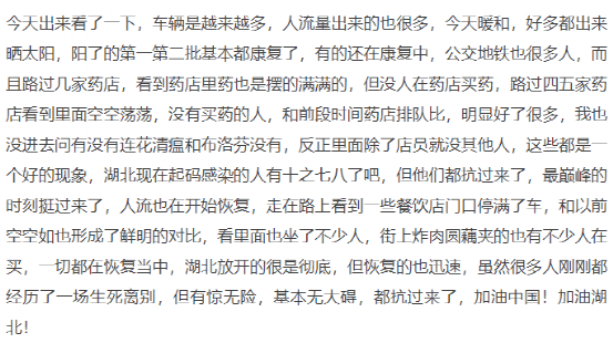 有網友在媒體平臺發消息稱,陽的第一第二批基本康復了,有的還在康復中,公交地鐵有很多人,路過幾家藥店,看到除了店員沒有其他人,餐飲店門口停滿了車,街上炸肉圓藕夾的也有不少人在買,一切都在恢復當中。