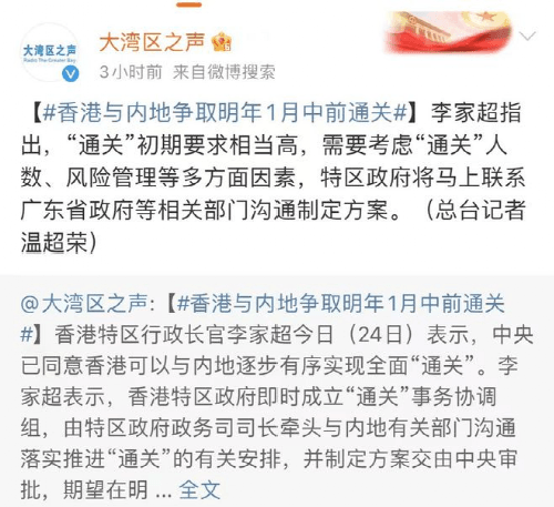 香港特區行政長官李家超于2022年12月24日表示,中央已同意香港可以與內地逐步有序實現全面“通關”。李家超表示,香港特區政府即時成立“通關”事務協調組,由特區政府政務司司長牽頭與內地有關部門溝通落實推進“通關”的有關安排,并制定方案交由中央審批,期望在2023年1月中之前逐步有序落實。