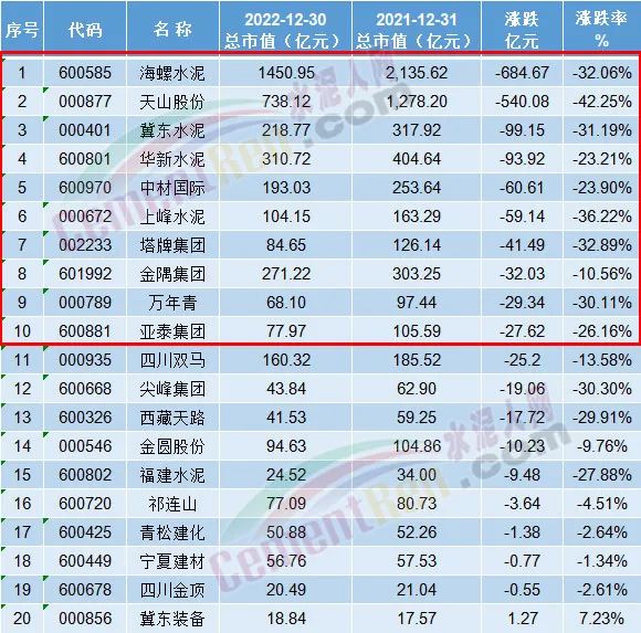 從水泥行業A股20家主流上市公司來看,市值蒸發達一千多億。