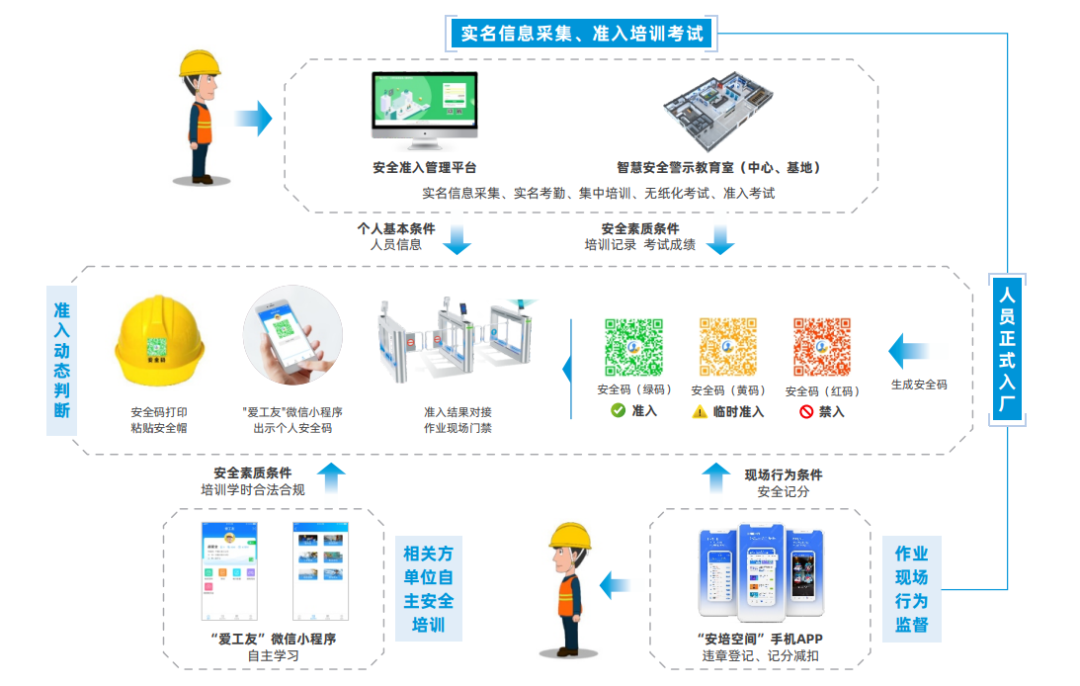 以水泥企業相關方人員“個人基本條件+安全素質條件+現場行為條件”為依據,綜合研判相關方人員準入狀態,生成安全碼,人因風險等級可視化。同時通過智慧安全警示教育室、安全準入管理平臺、“愛工友”微信小程序等用于人員信息采集、準入培訓考核、作業行為監督,嚴控相關方人員安全準入,降低人因安全風險,減少安全事故的發生。
