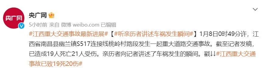 1月8日凌晨,江西南昌縣發生一起重大交通事故,截止1月9日16時,已造成19人死亡21人受傷。當地居民透露,因逝者家屬需早晨5點前到殯儀館排隊拿號,故村民于凌晨出殯,后被貨車撞上送行隊伍造成死傷。