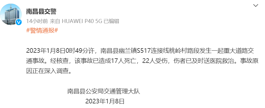 當地居民提供的官方通報稱,2023年1月8日0時50分,在南昌縣幽蘭鎮桃嶺村紅溪章家自然村發生一起重大交通事故,一輛重型半掛牽引車(屬于樂平某物流公司),撞上出殯隊伍,初步掌握,事故已造成17人死亡、22人受傷,傷者已送往醫院搶救,車輛核載質量32700KG,車輛裝載砂石。