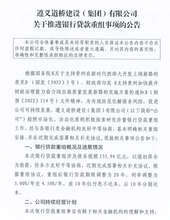 近日,貴州遵義最大城投——遵義道橋建設(集團)有限公司(下稱“遵義道橋”)披露的銀行貸款重組方案引起廣泛關注。根據重組協議,155.94億元銀行貸款重組后期限調整為20年,利率調整為3%/年~4.5%/年,前10年僅付息不還本,后10年分期還本。近156億元銀行債務展期至20年實屬罕見。