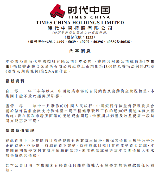時代中國表示“深受2021年下半年以來,房地產銷售轉差的嚴重影響。公司的整體資金緊張,無法公平支付整體的離岸債,所以公司將整體暫停所有離岸債的支付”。這是時代中國第一次以官方公告的方式,承認自己無力支付債務,也就是公開債務爆雷了。