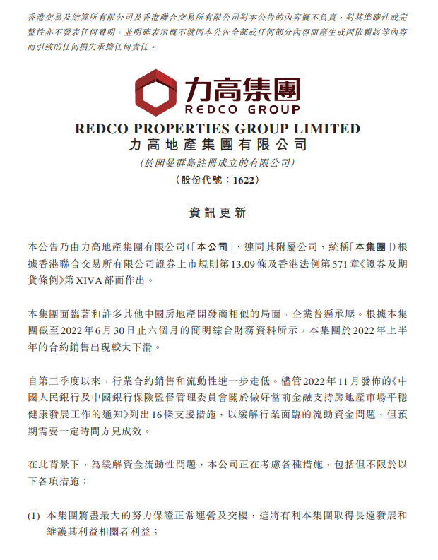 另一家,多年位列中國地產TOP100的力高集團,也在2022年的最后一個工作日發布公告,鑒于流動資金有壓力,將暫停境外債務付款。公司將盡最大的努力保證正常運營及交樓。