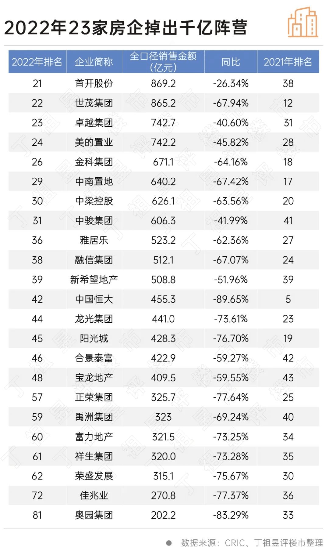 據水泥人網了解,2022年,多數規模房企深陷負增長困局,百強房企全年業績有九成下滑。2022年成為房企洗牌年,最明顯的標志是,千億房企數量銳減一半。