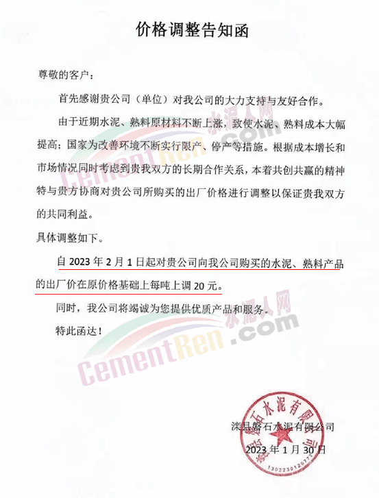 日前,唐山圣龍水泥有限公司、唐山燕東水泥股份有限公司、灤縣磐石水泥有限公司等水泥企業發布價格調整告知函稱,由于近期水泥、熟料原材料不斷上漲,致使水泥、熟料成本大幅提高;國家為改善環境不斷實行限產、停產等措施。根據成本增長和市場情況自2023年2月1日起對水泥、熟料產品的出廠價格上調20元/噸。