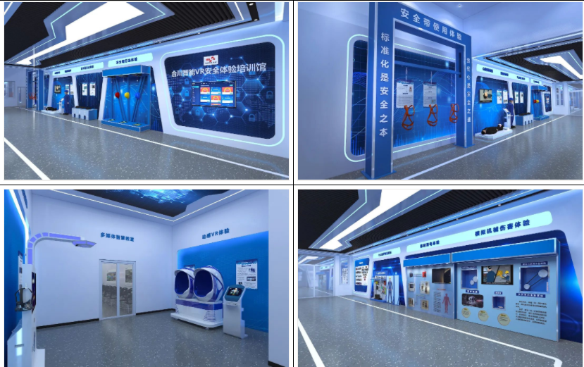 金隅冀東水泥合川有限公司智能VR安全體驗培訓館分為前廳、安全防護認知區、事故傷害實訓區、多媒體智慧教室、VR事故體驗區共五大功能區,采用“正向實訓、逆向體驗、安全互動”的安全培訓創新模式。