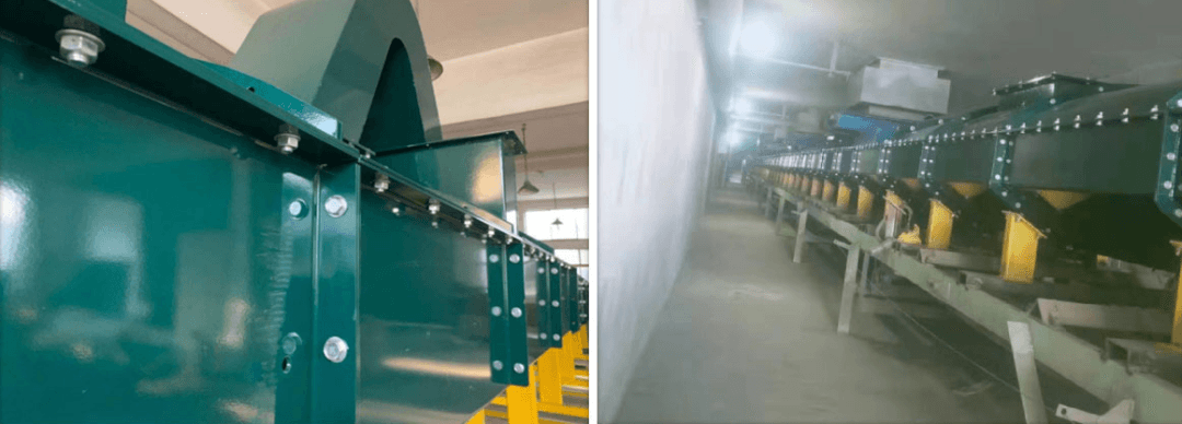 其結構特點除下料口處理(導流槽),檢修孔,回程清灰三種結構,與精密微動力導料槽相同外,還有針對性地在各法蘭間使用密封條進行密封,防溢裙邊磨損時,依靠橡膠彈力,自動跟蹤皮帶進行密封。