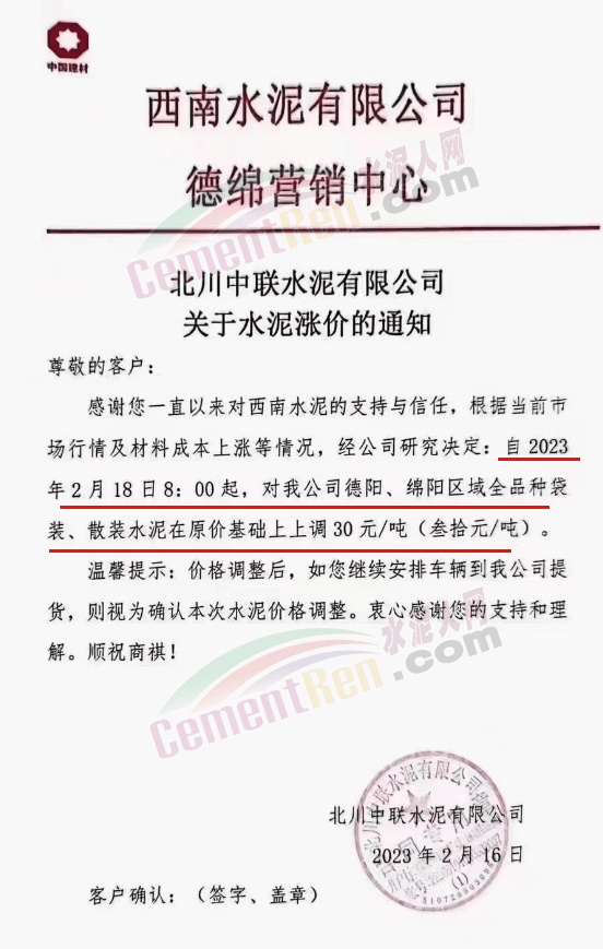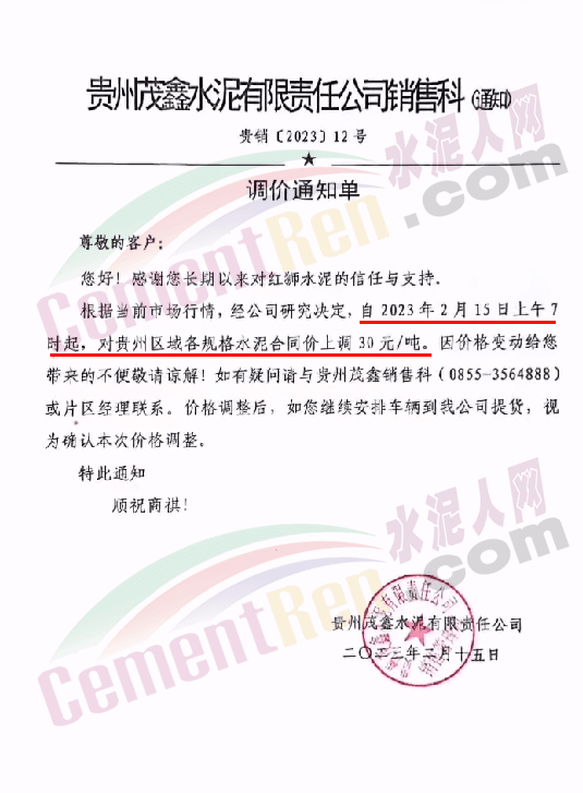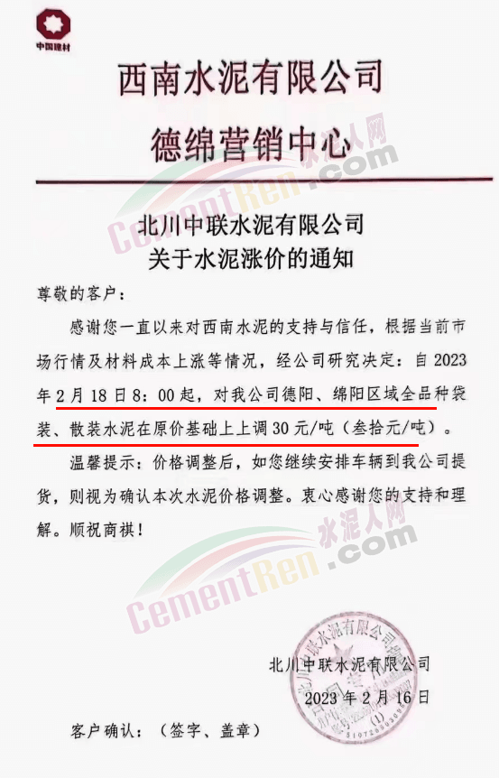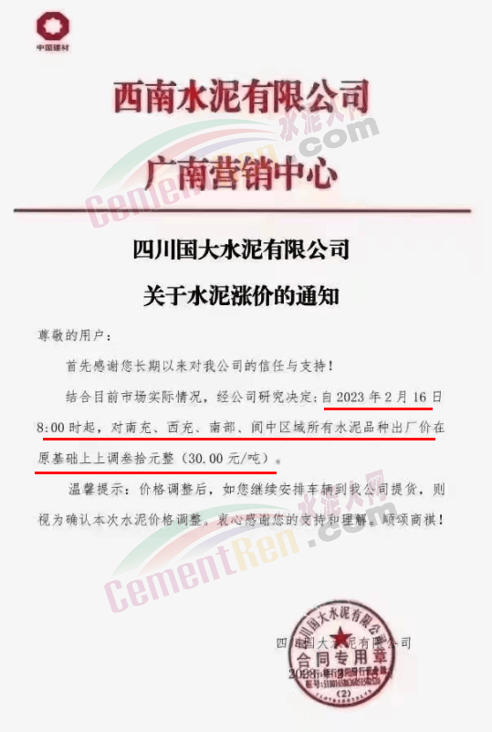 水泥人網通訊員消息,近日 ,西南地區四川、重慶、貴州多地主要品牌企業通知上調水泥價格20-30元/噸。