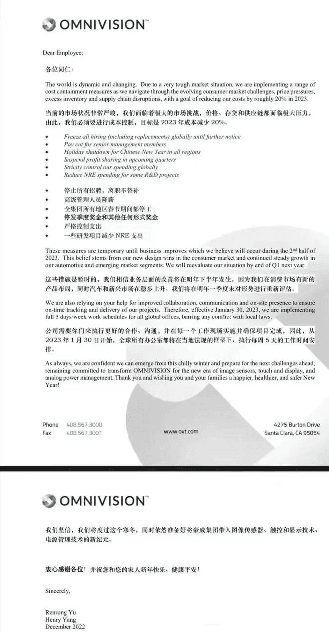 延續了近兩年的科技公司裁員潮和互聯網企業優化潮仍在繼續,2023年全球科技業宣布的裁員計劃總數目前已超過10萬人,接近2022年整年的裁員數量。美國芯片企業豪威集團(OmniVisionGroup)預警,2023年市場需求不樂觀,運營將面臨極大的挑戰,宣布采用停招、降薪等一系列措施控制成本,以使明年成本減少20%,并表示這些措施是暫時的,將在明年一季度末對形勢進行重新評估。