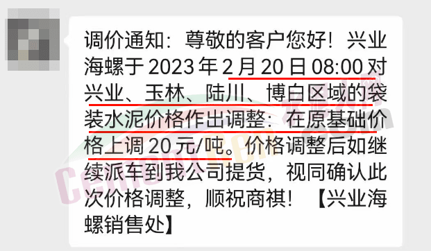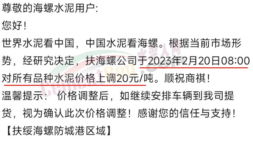 海螺水泥通知,于2月20日0時起,對廣西區域全品項水泥價格上調20元/噸。并提示,價格調整后,若繼續安排車輛提貨,視為確認此次價格調整。
