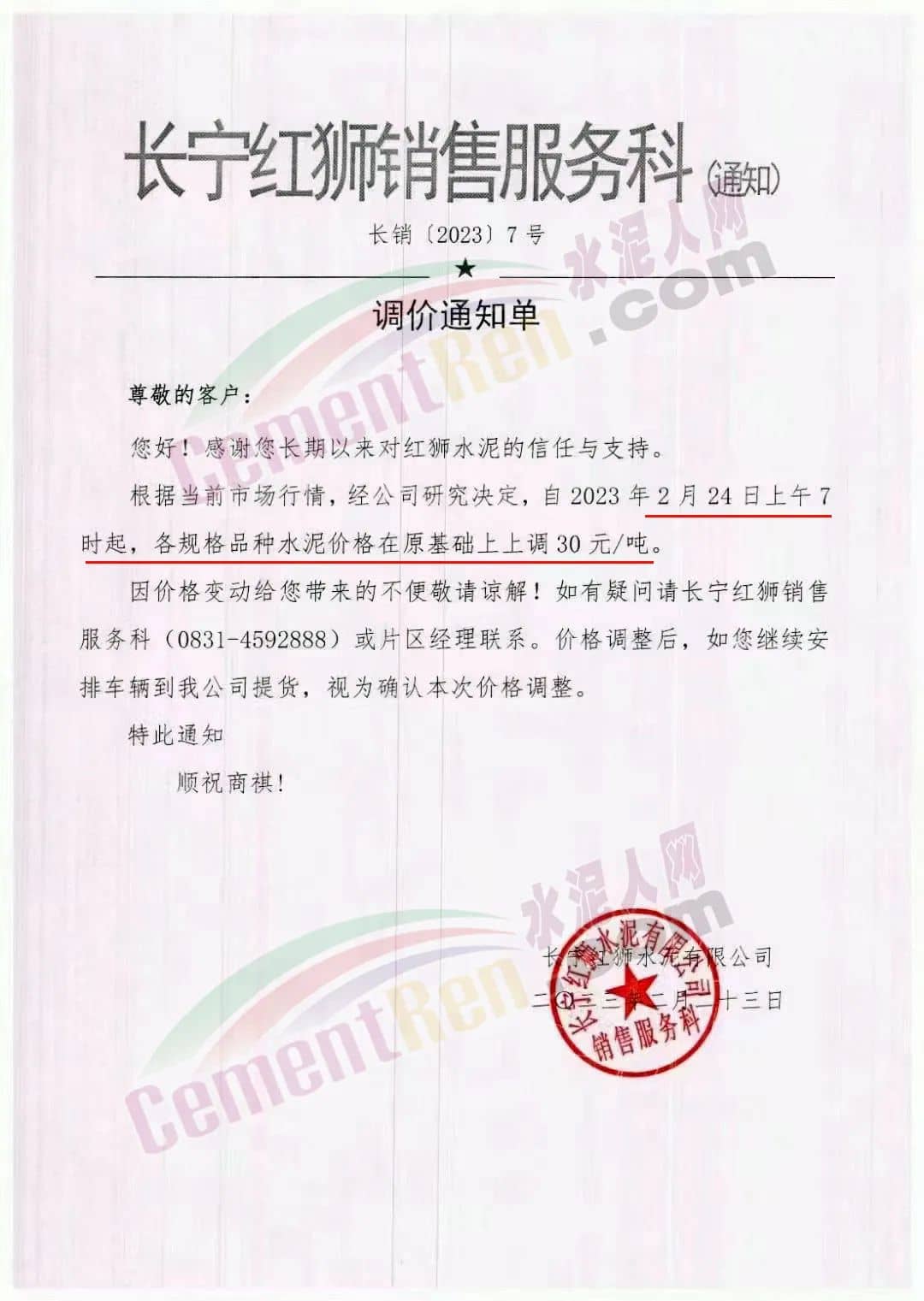 長寧紅獅銷售服務科通知,根據當前市場行情,經公司研究決定,自2023年2月24日上午7時起,各規格品種水泥價格在原基礎上上調30元/噸。