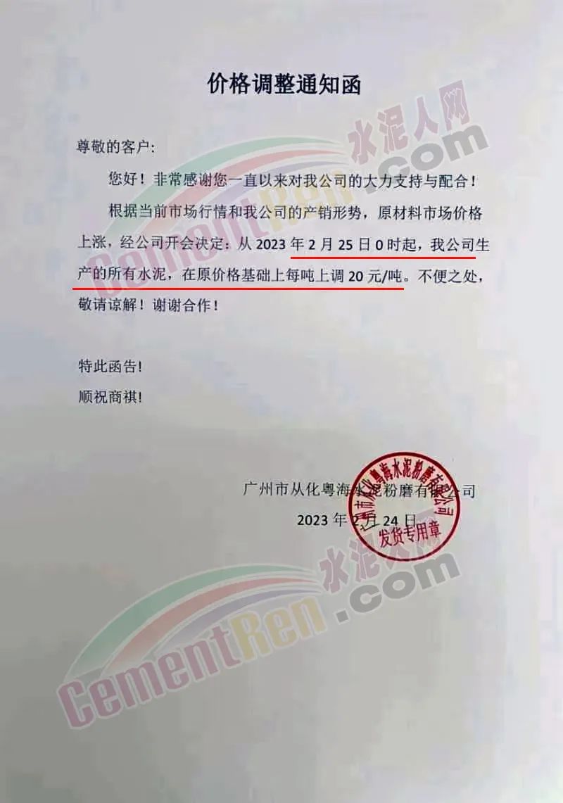 日前,廣州市從化粵海水泥粉磨有限公司通知,根據當前市場行情和公司的產銷形勢,原材料市場價格上漲,從2023 年2月25日0時起,公司生產的所有水泥,在原價格基礎上每噸上調 20 元/噸。