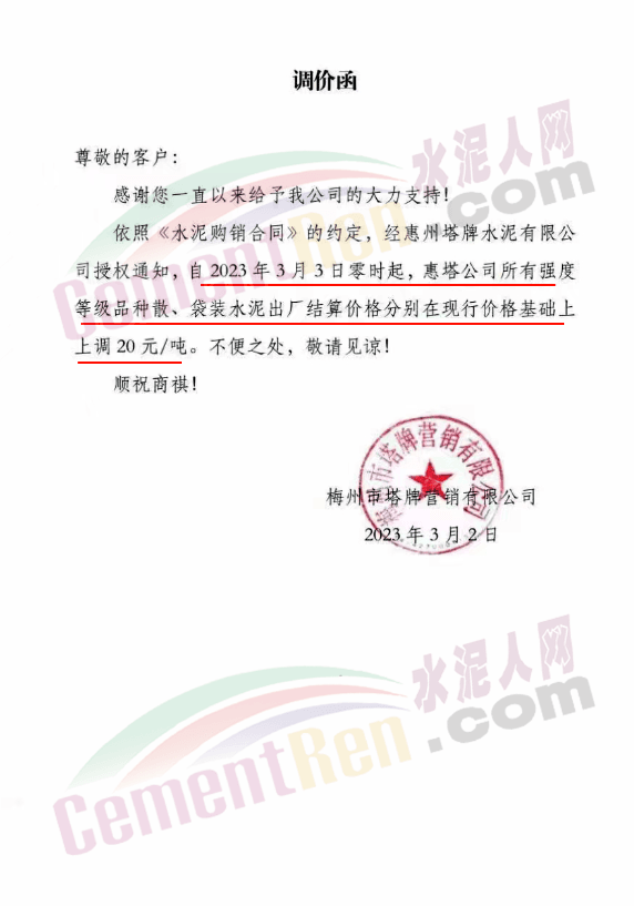塔牌水泥通知,經惠州塔牌水泥有限公司授權通知,自3月3日零時起,惠塔公司所有強度等級品種散、袋裝水泥出廠結算價格分別在現行價格基礎上上調20元/噸。