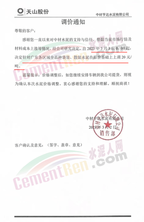 中材天山(云浮)水泥通知,根據當前市場行情及材料成本上漲等情況,經公司研究決定,自3月3日0時起對廣東各區域全品種袋裝、散裝水泥在原價基礎上上調20元/噸。
