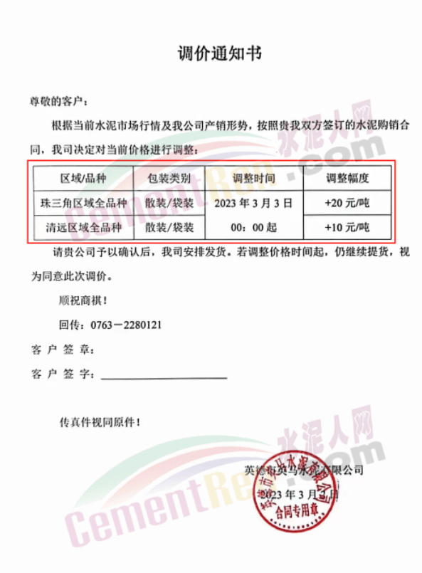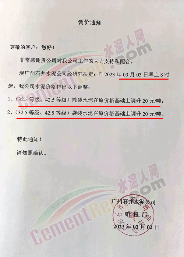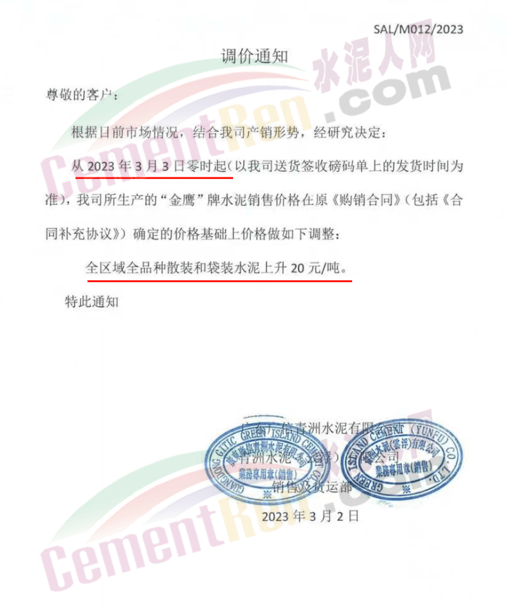 東莞市國鉅建材有限公司通知,根據市場行情及各種原材料價格持續上漲,經公司研究決定從2023年3月4日早上8時起,公司生產的所有品種水泥在原有價格的基礎上上調20元/噸。