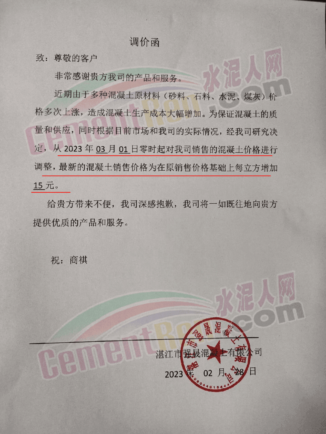 通常水泥上漲30元/噸,商混成本增加10元/噸。隨著水泥價格連續上漲,下游混凝土及水泥制品企業也陸續通知上調產品價格。由于多種混凝土原材料(砂料、石料、水泥、煤灰)價格多次上漲,造成混凝土生產成本大幅增加。為保證混凝土的質量和供應,同時根據目前市場和公司的實際情況,經公司研究決定,從2023年3月1日0時起對公司銷售的混凝土價格進行調整,最新的混凝土銷售價格為在原銷售價格基礎上每立方增加15元。