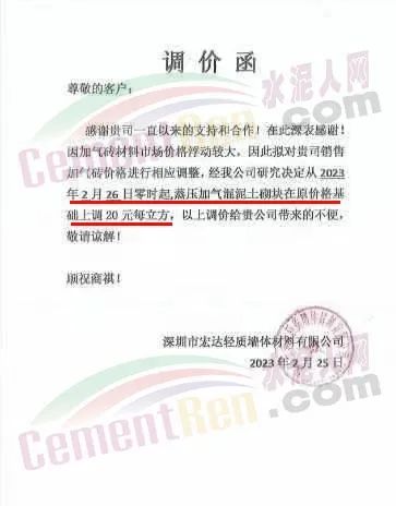 深圳市宏達輕質墻體材料有限公司通知,因加氣磚材料市場價格浮動較大,經公司研究決定從2023年2月26日零時起,蒸壓加氣混凝土砌塊在原價格基礎上調20元每立方。