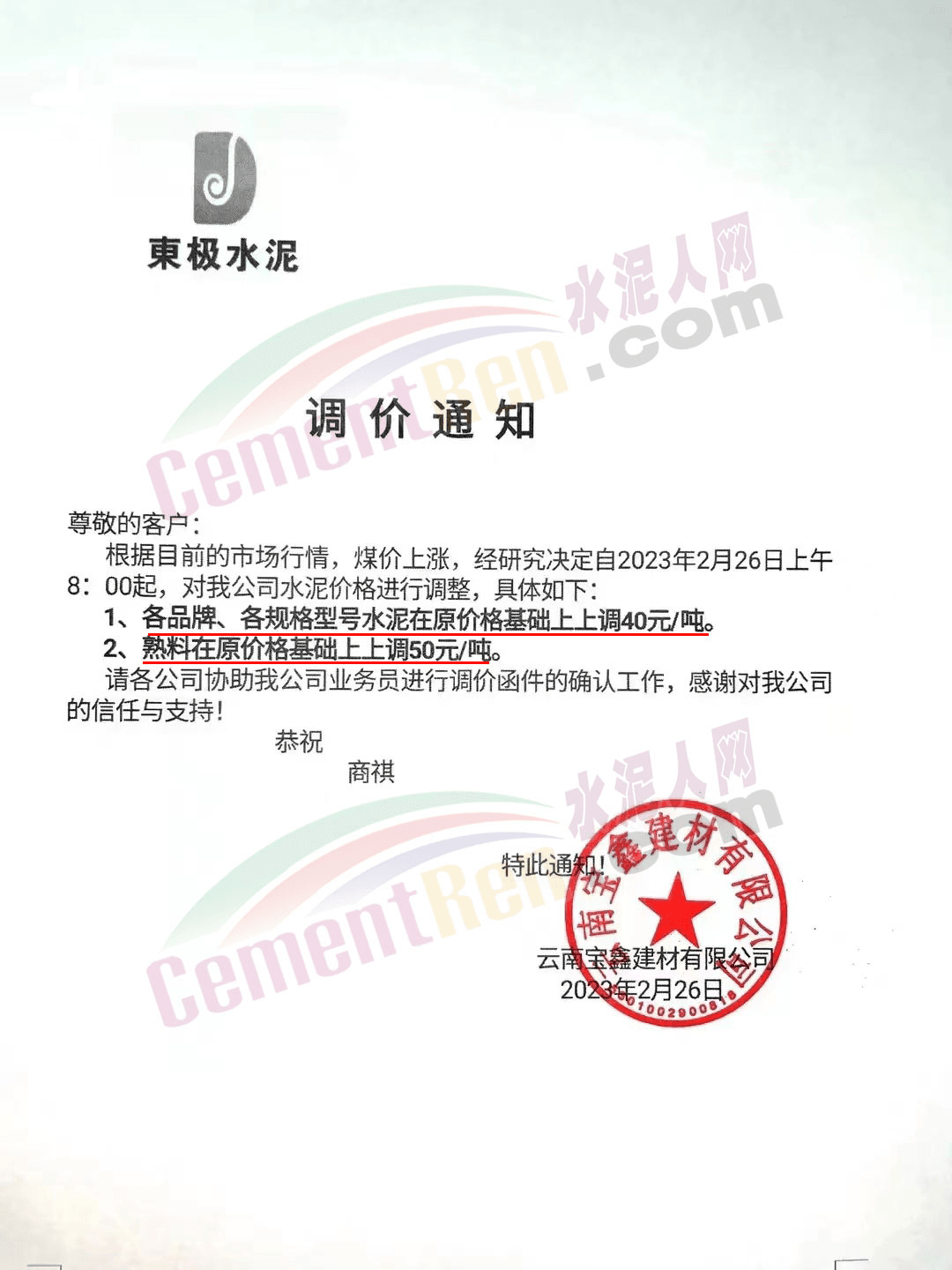 云南寶鑫建材有限公司通知,根據目前的市場行情,煤價上漲,經研究決定自2023年3月2日上午8時起,對公司袋裝32.5各規格型號水泥在原價格基礎上上調55元/噸,其他品種水泥價格在基礎上上調30元/噸。