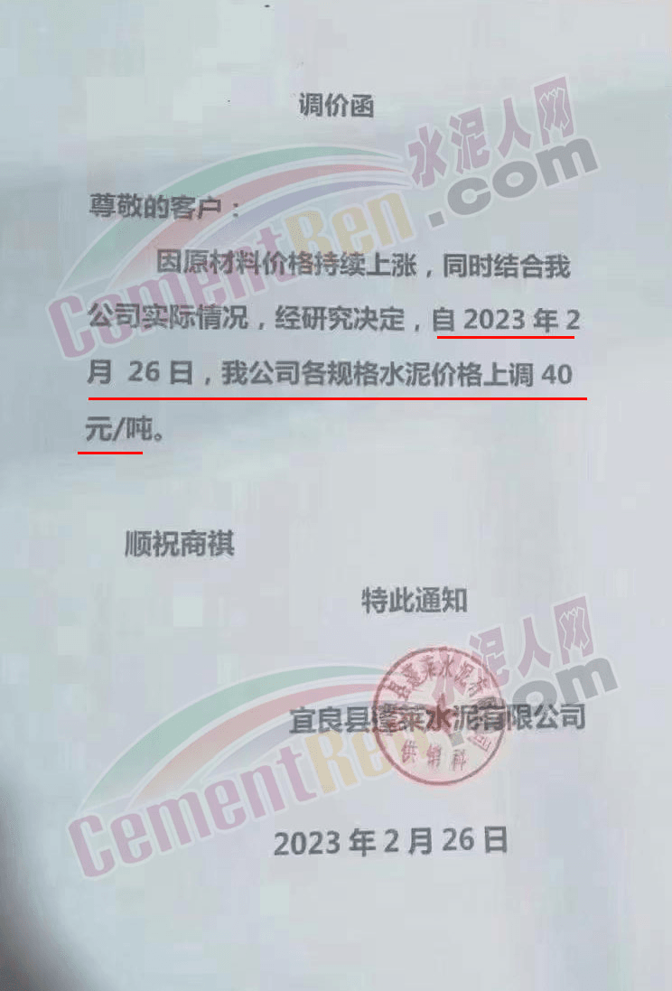 宜良縣永興水泥有限公司銷售科通知,由于原材料價格上漲,生產成本增加,經公司研究決定從2023年2月26日7時起32.5型號水泥上調40元/噸。