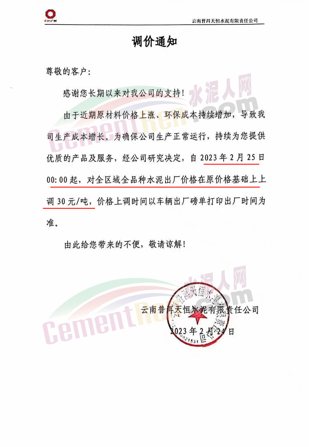 云南普洱天恒水泥有限責任公司通知,由于近期原材料價格上漲、環保成本持續增加,導致公司生產成本增長。為確保公司生產正常運行,經公司研究決定,自2023年2月25日0時起,對全區域全品種水泥出廠價格上調30元/噸。