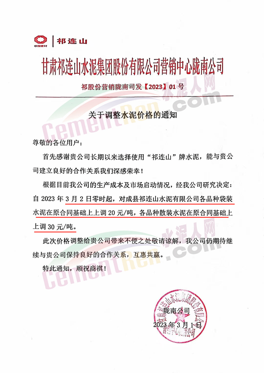 同期,甘肅區域龍頭企業祁連山水泥隴南公司通知,根據目前公司的生產成本及市場啟動情況,經公司研究決定自2023年3月零時起,對成縣祁連山水泥有限公司各品種袋裝水泥在原合同基礎上上調20元/噸,各品種散裝水泥在原合同基礎上上調30元/噸。