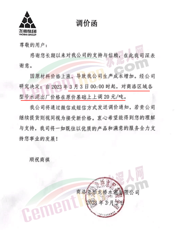 陜西主要品牌商洛堯柏龍橋水泥通知,因原材料價格上漲,導致公司生產成本增加,經公司研究決定自3月3日0時起,對商洛區域各型號水泥出廠價格上調20元/噸。