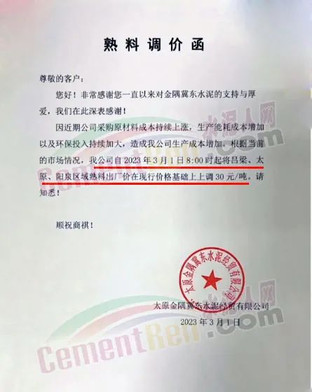 太原金隅冀東水泥通知因近期公司采購原材料成本持續上漲,生產能耗成本增加以及環保投入持續加大,造成公司生產成本增加。根據當前的市場情況,公司自2023年3月1日8時起將呂梁、太原、陽泉區域熟料出廠價在現行價格基礎上上調30元/噸。