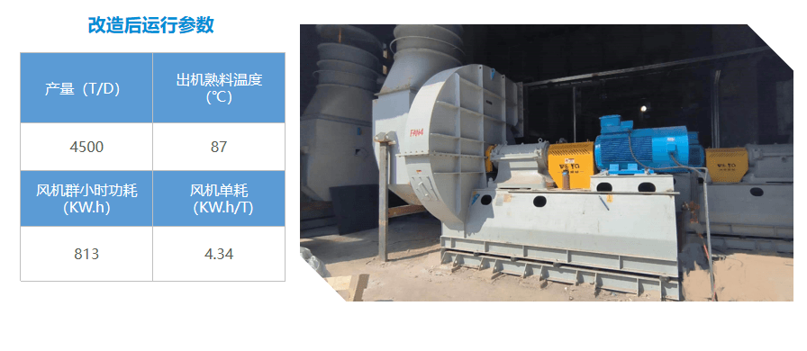 該企業裝備兩條日產5000噸規模的熟料生產線,2022年推進的A線改造廠家改選用沃亞機械的高效篦冷機冷卻風機,投入運行4個月時間,通過三方技術標定,本項目冷卻風機運行效率高(風機群整體運行效率>83.8%),冷卻電耗表現非常優異,電耗明顯優于同類項目,達到國內同類技改最佳水平。