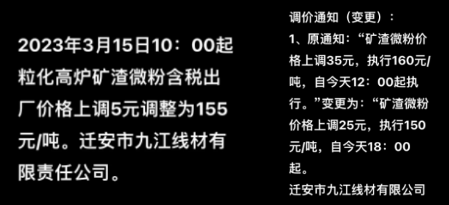3月11日佛山市南海區泌沖水泥混凝土有限公司、佛山市南海建源混凝土有限公司發調價通知稱,鑒于近期水泥、碎石、河砂等原材料價格的持續上漲,造成混凝土生產成本大幅攀升。經公司研究決定:自2023年3月16日零時起商品混凝土和預拌砂漿單價在現行單價基礎上上調50元/方,其他標號以此類推,同時按新價格結算。