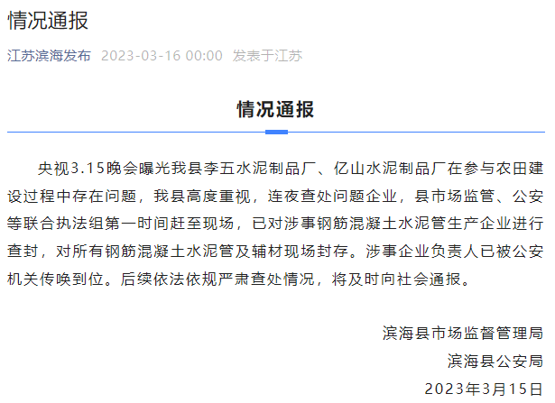 據“江蘇濱海發布”微信號16日0時消息,濱??h市場監督管理局、濱??h公安局通報稱,央視“3.15”晚會曝光濱??h李五水泥制品廠、億山水泥制品廠在參與農田建設過程中存在問題,濱??h高度重視,連夜查處問題企業,縣市場監管、公安等聯合執法組第一時間趕至現場,已對涉事鋼筋混凝土水泥管生產企業進行查封,對所有鋼筋混凝土水泥管及輔材現場封存。涉事企業負責人已被公安機關傳喚到位。后續依法依規嚴肅查處情況,將及時向社會通報。