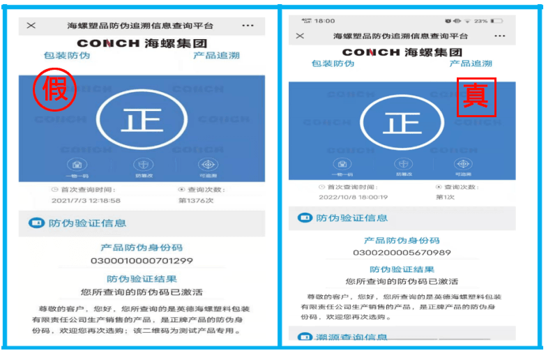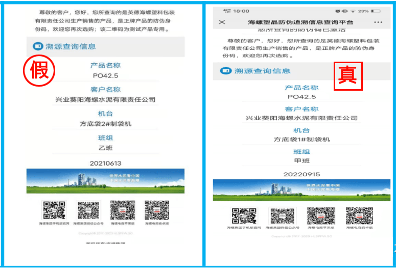 防偽碼查詢:查詢二維碼查看袋子生產日期與外包裝生產日期是否一致。例:假水泥二維碼查詢袋子生產日期為2021年6月13日,包裝袋印刷生產日期為2022年9月5日,兩者不一致;“海螺牌”水泥二維碼袋子生產日期與袋子外印刷生產日期一致。