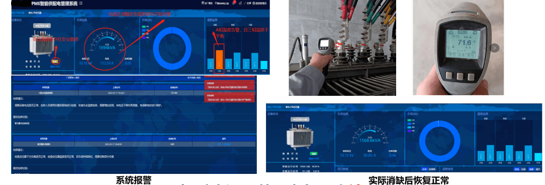 實現效果:實時看護關鍵設備,做到溫度異常實時監測,故障類型可智能化分析,故障隱患可準確預警,主動推送設備報警信息,提示電氣人員快速準確檢修,避免了變壓器過熱燒毀、跳閘引起負載端設備停機,造成停產損失,保障了系統和設備的穩定運行。