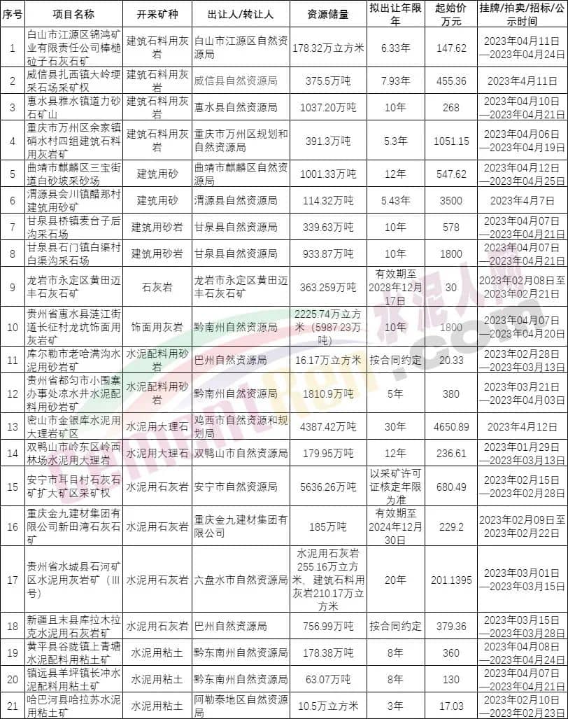 沒有礦山就沒有成本優勢,所謂得礦山者得市場,在激烈的市場競爭中自有礦山被水泥企業認定為實力的象征。據水泥人網不完全統計,近期自然資源部公告掛牌出讓的21個礦山項目,擬出讓采礦權的礦山項目中出讓年限中最長的達30年,起始價達4650.89萬元。