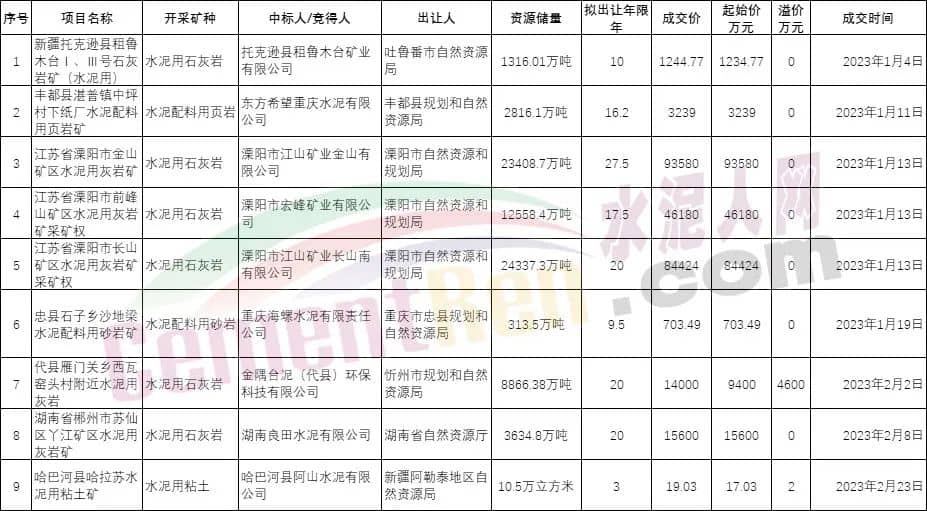 已成交9宗礦山競得企業包含重慶海螺水泥有限責任公司、金隅臺泥(代縣)環??萍加邢薰?、湖南良田水泥有限公司、東方希望重慶水泥有限公司等水泥行業知名企業。