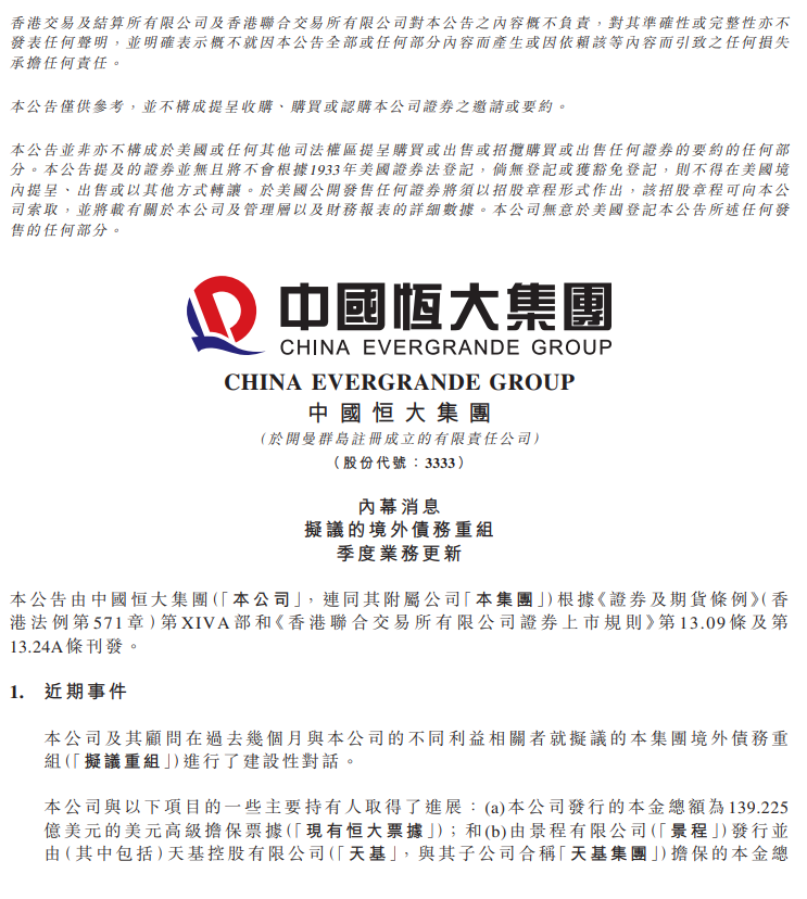 3月22日深夜,中國恒大發布了一份超過價值千億的重磅協議,將發行新的債券對原債券進行置換。新債券年限4至12年、年息2%至7.5%,前三年不付息,第四年初開始付息、付本金的0.5%。這意味著在時隔15個月后,恒大境外重組方案終于浮出水面,恒大重組也邁入了關鍵一步。