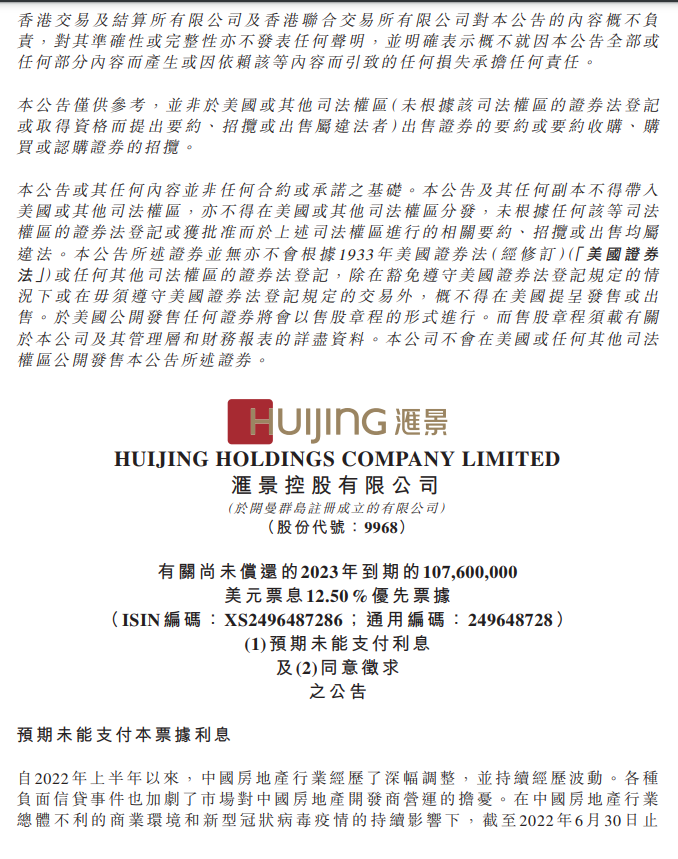 匯景控股:預期未能償還2023年到期1.08億元12.50%優先票據利息。