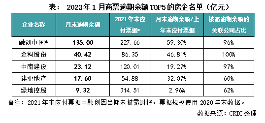 在今年1月TOP200梯隊的50家逾期房企集團名單中,共涉及旗下804個項目公司發生商票未支付,金科商票逾期余額40.42億;中南旗下73個項目公司出現商票逾期,逾期余額23.1億;建業和綠地商票逾期余額分別17.6億和9.3億,都是前期高度依賴商票融資。
