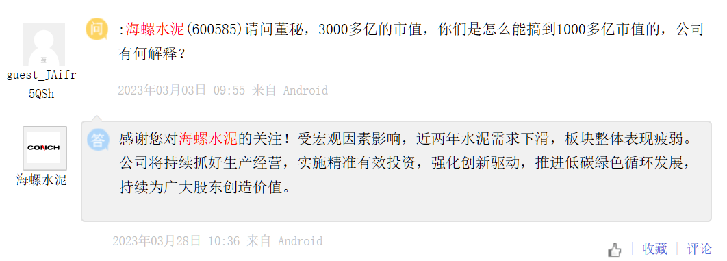 3月27日晚間,海螺水泥發布2022年年報,或因其業績下滑幅度較大,多位投資者在上市平臺針對海螺水泥市值蒸發1000多億以及2023年業績發展、采購成本、海外投資、產品細節提問,甚至的投資者表示希望海螺水泥繼續通過價格戰,將近年高杠桿擴張的同行拖死。28日海螺水泥上市公司集中回復了多位投資者提問。
