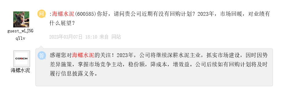 海螺水泥回復稱,2023年,公司將繼續深耕水泥主業,抓實市場建設,因時因勢差異施策,掌握市場競爭主動,穩份額,降成本,增效益。