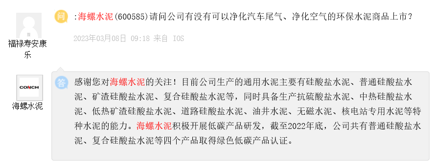 海螺水泥回復:目前公司生產的通用水泥主要有硅酸鹽水泥、普通硅酸鹽水泥、礦渣硅酸鹽水泥、復合硅酸鹽水泥等,同時具備生產抗硫酸鹽水泥、中熱硅酸鹽水泥、低熱礦渣硅酸鹽水泥、道路硅酸鹽水泥、油井水泥、無磁水泥、核電站專用水泥等特種水泥的能力。海螺水泥積極開展低碳產品研發,截至2022年底,公司共有普通硅酸鹽水泥、復合硅酸鹽水泥等四個產品取得綠色低碳產品認證。