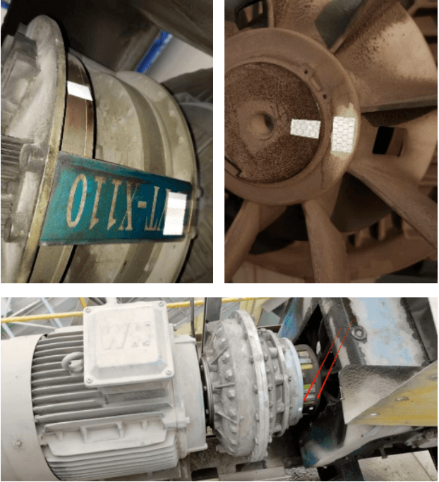 1.設備停機時對各設備聯軸方式進行檢查、清理,選擇合適位置粘貼反光貼紙。因現場粉塵較大,為防止粘貼不牢固原因導致設備運行后反光貼紙掉落影響檢測,部分位置選擇多處檢測點粘貼并進行標記。