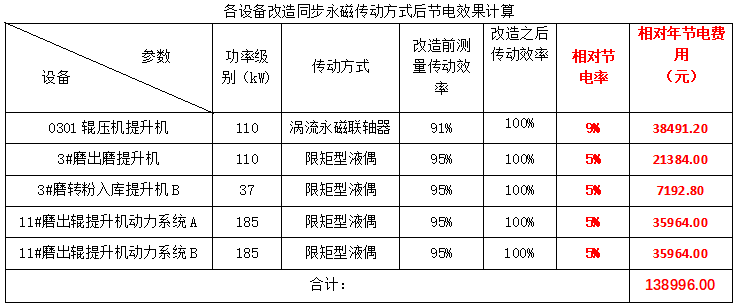 使用同步永磁耦合器針對液偶、渦流永磁工況進行改造,可明顯提升設備運行效率,降低損耗,從而達到節能的效果,數據計算結果如下表所示: