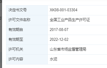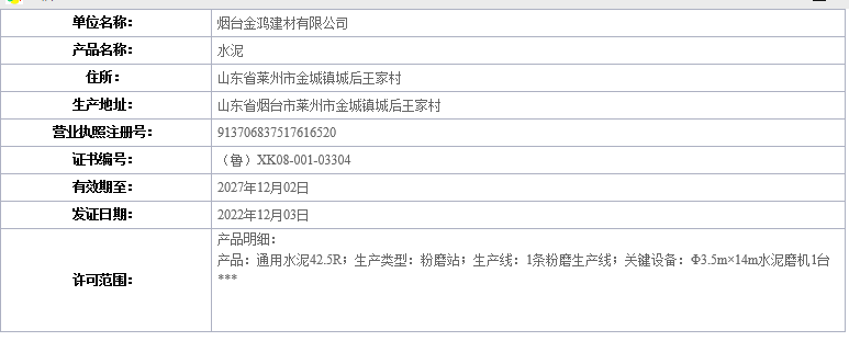 企業新申請的生產許可證編號為(魯)XK08-001-03304 ,有效期至2022年12月2日。許可范圍為1條粉磨生產線,關鍵設備為Φ3.5m×14m水泥磨機1臺。