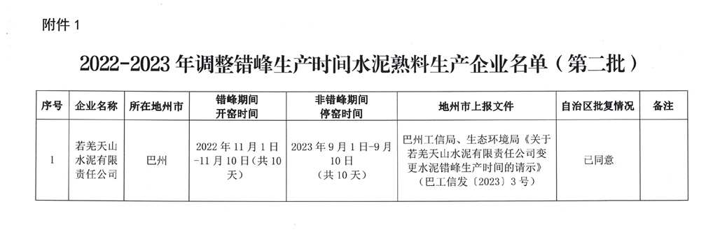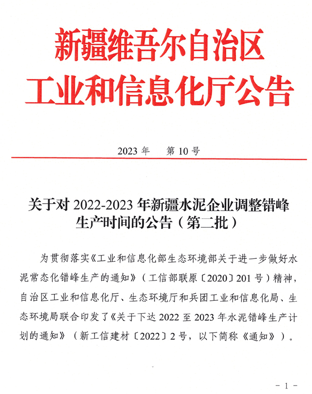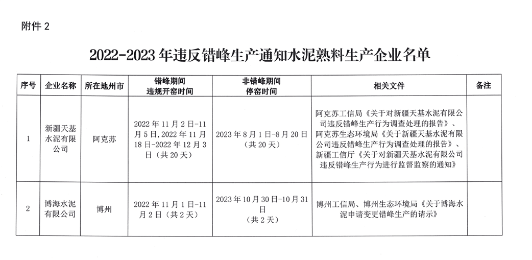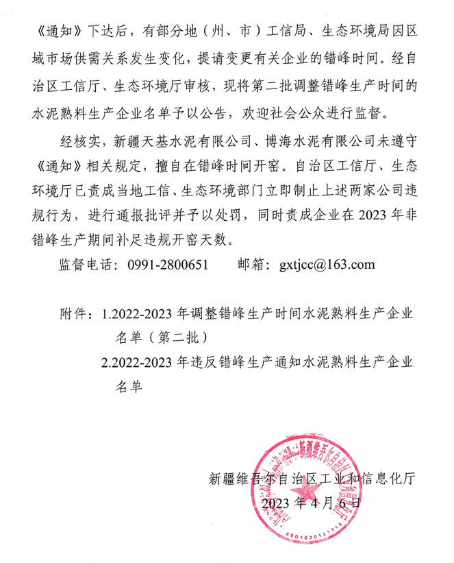 日前,新疆維吾爾自治區工信廳發布公告文件公開通報新疆天基水泥有限公司、博海水泥有限公司未遵守《通知》相關規定,擅自在錯峰時間開窯。自治區工信廳、生態環境廳已責成當地工信、生態環境部門立即制止上述兩家公司違規行為,進行通報批評并予以處罰,同時責成企業在 2023 年非錯峰生產期間補足違規開窯天數。
